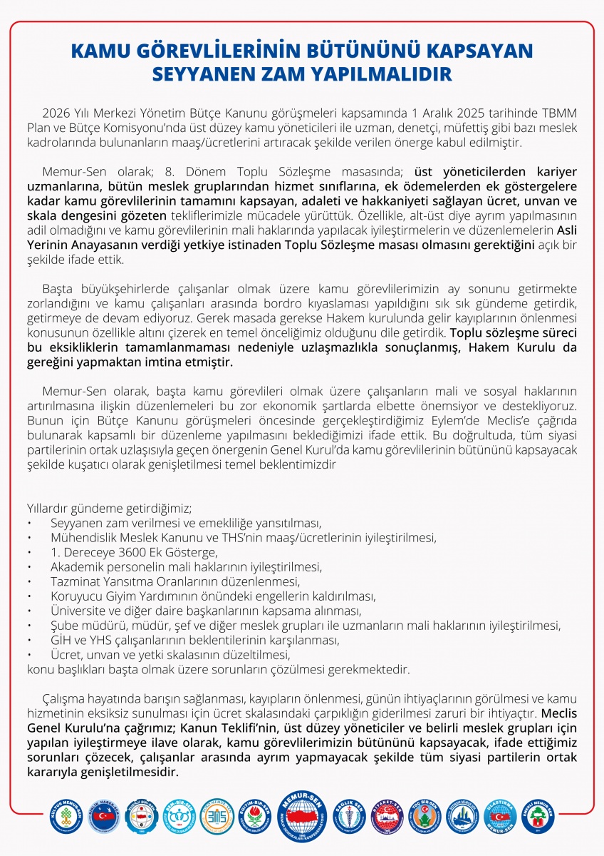 KAMU GÖREVLİLERİNİN BÜTÜNÜNÜ KAPSAYAN SEYYANEN ZAM YAPILMALIDIR