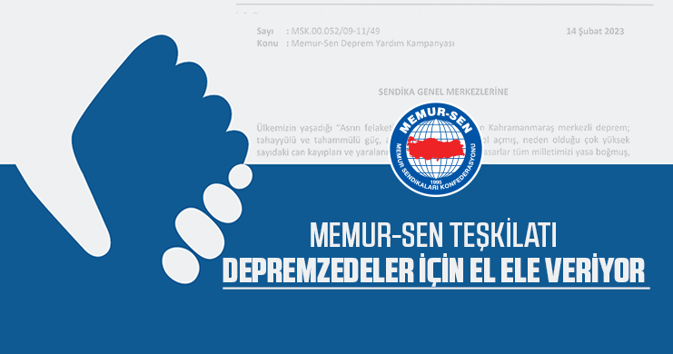 Merkez üssü Kahramanmaraş olan 7,7 ve 7,6 şiddetindeki iki büyük deprem birçok acıyı da beraberinde getirdi. Depremin ardından bölgeye sevk edilen Memur-Sen Arama Kurtarma Ekibi’nin ardından Memur-Sen Genel Başkanı Ali Yalçın ve bağlı sendikaların genel başkanları da sahaya çıkarak arama kurtarma çalışmalarına katıldı. Yapılan çalışmaların ardından sorumluluk bilinciyle çalışmalarını sürdüren Memur-Sen teşkilatı; 71 ilden deprem bölgesine yardım TIR’ları gönderdi.