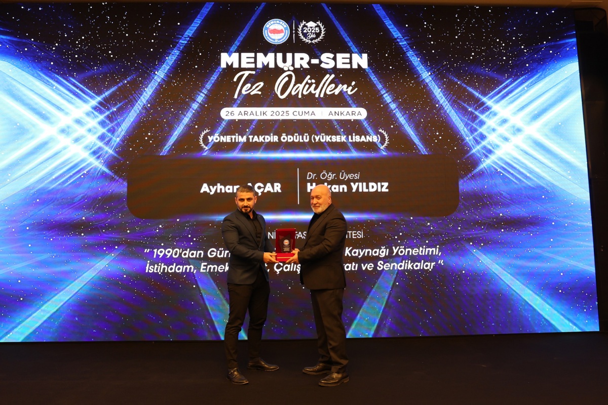 Türk Hava Kurumu Üniversitesi’nden Ali Deniz, Doç. Dr. Alper Bahadır Dalmış danışmanlığında hazırlanan “Sendikalarda Örgütsel Adalet Algısının İş Performansı Üzerindeki Etkisinde Psikolojik İyi Oluşun Aracılık Rolü: Memur Sendikaları Konfederasyonu Çalışanları Üzerinde Bir Araştırma” başlıklı çalışmasıyla Yönetim Takdir Ödülü’ne layık görüldü.