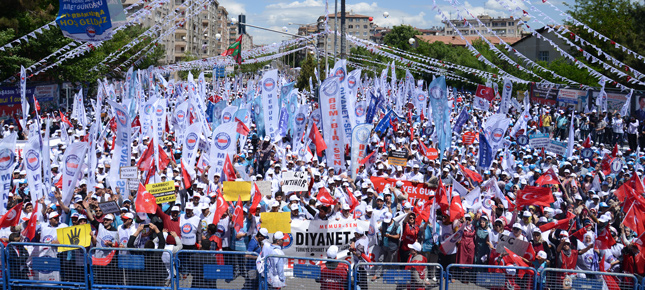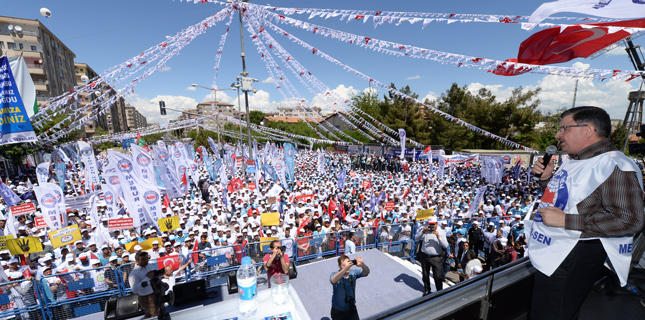 1 Mayıs Emek ve Dayanışma Günü, Memur-Sen tarafından Diyarbakır İstasyon Meydanı’nda düzenlenen etkinlikle kutlandı. Tertip Komitesi adına konuşan Memur-Sen Genel Başkan Yardımcısı ve Sağlık-Sen Genel Başkanı Metin Memiş, emeği ve alın terini en kıymetli değer olarak kabul ettiklerini söyledi. Evrensel hukuk ve kadim medeniyet parolasıyla, bin yıllık desende bir ve beraberliğe vurgu yapmak için mitingi Diyarbakır’da yaptıklarını söyleyen Memiş, mazlumların haklarını, emek ve emeğin gür sesini haykırmak için toplandıklarını söyledi.