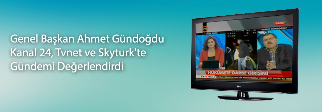 Memur Sendikaları Konfederasyonu Genel Başkanı Ahmet Gündoğdu, Kanal 24, Tvnet ve Skyturk’te yayınlanan programlarda AK Parti ile cemaat arasında yaşanan tartışmalar, 17 Aralık operasyonu, Cumhuriyet Savcısının basın bildirisi dağıtması ve yolsuzluk iddiaları ile ilgili açıklamalarda bulundu. 17 Aralık Operasyonunun Hükumete karşı tezgahlanan oyunun bir parçası olduğunu kaydeden Gündoğdu şunları kaydetti: “ 17 Aralık Operasyonunun perde arkası aralandıkça Sayın Başbakan üzerinden doğrudan Türkiye'nin hedef alındığı bir operasyon olduğunu görüyoruz. Belki bu operasyon Hükumete karşı yapılacak olan büyük operasyonunun ön denemesi olabilir.” Başsavcının altında çalışan bir savcının basın bildirisi dağıtmasının kabul edilemez bir durum olduğunu belirten Gündoğdu, “Bütün yargıçların verdiği kararlarda Türk milleti adına karar vermesi lazım” ifadelerini kullandı."