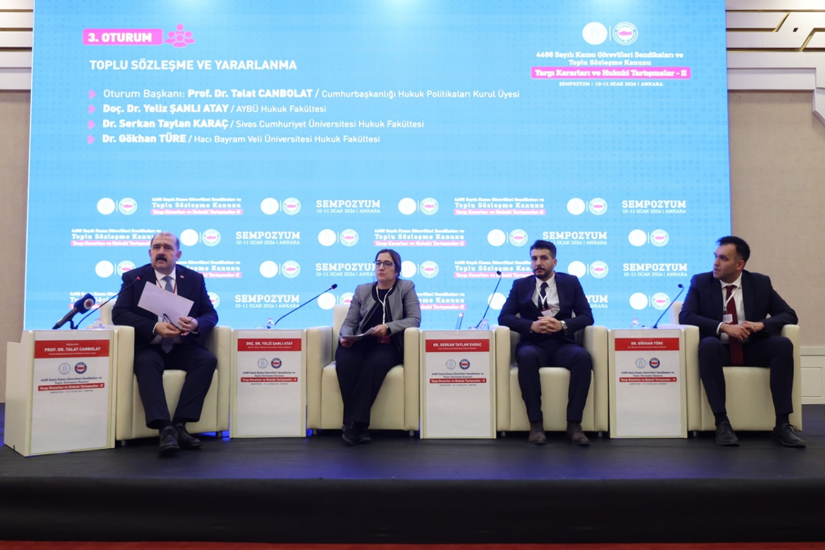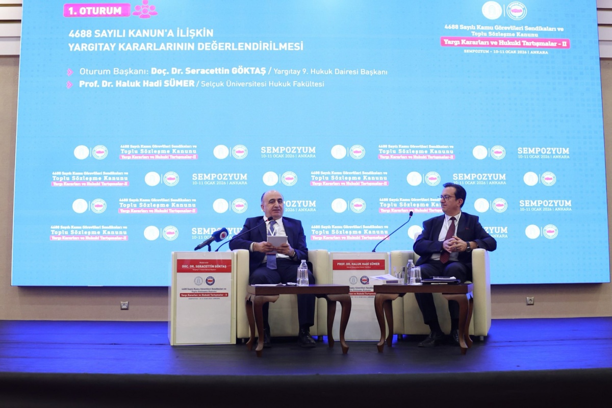 Sempozyumun birinci oturumu, Yargıtay 9. Hukuk Dairesi Başkanı Doç. Dr. Seracettin Göktaş’ın oturum başkanlığında gerçekleştirildi. Oturumda, Selçuk Üniversitesi Hukuk Fakültesi öğretim üyesi Prof. Dr. Haluk Hadi Sümer, “4688 sayılı Kanun’a ilişkin Yargıtay kararlarının değerlendirilmesi” başlıklı sunumunu yaptı. Prof. Dr. Sümer, Yargıtay İçtihatlarının Sendikal Haklar, Toplu Sözleşme Süreçleri ve Kamu Görevlilerinin Çalışma hayatına etkilerine ilişkin değerlendirmelerde bulundu.