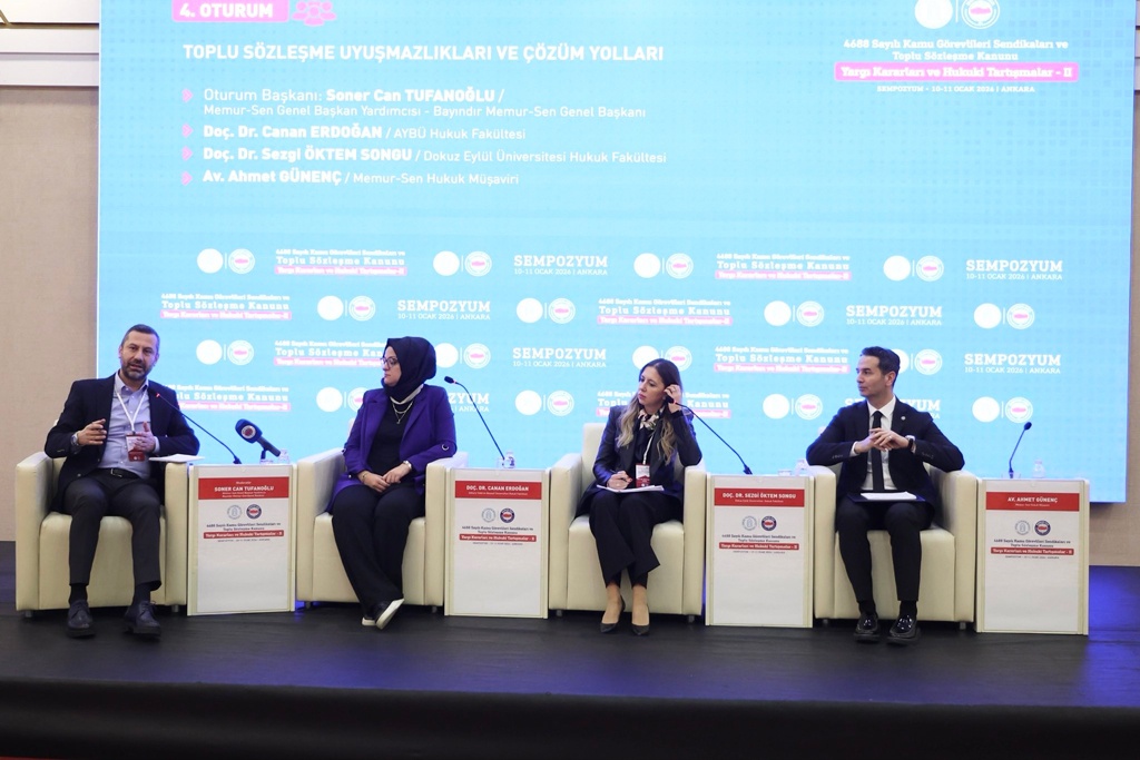 Sempozyumun ikinci gününde dördüncü oturum, Memur-Sen Genel Başkan Yardımcısı ve Bayındır Memur-Sen Genel Başkanı Soner Can Tufanoğlu’nun moderatörlüğünde yapıldı. “Toplu sözleşme uyuşmazlıkları ve çözüm yolları” başlığı altında düzenlenen oturumda, AYBÜ Hukuk Fakültesi öğretim üyesi Doç. Dr. Canan Erdoğan, uyuşmazlıkların barışçıl çözüm yollarına ilişkin değerlendirmelerde bulundu. Dokuz Eylül Üniversitesi Hukuk Fakültesi öğretim üyesi Doç. Dr. Sezgi Öktem Songu, yargı kararları ışığında iş bırakma eylemleri ve grev hakkını ele aldı. Memur-Sen Hukuk Müşaviri Ahmet Günenç ise toplu sözleşmenin bağlanmasından uygulanmasına kadar geçen süreçte yapısal dönüşüm ihtiyacına dikkat çekti.