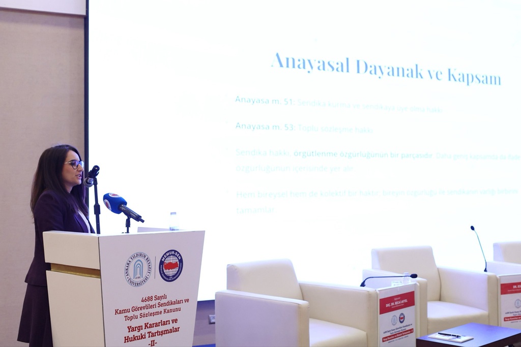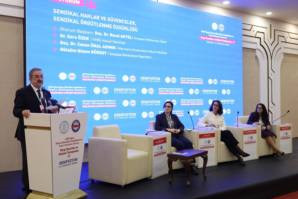 Sempozyumun beşinci ve son oturumu, Anayasa Mahkemesi Üyesi Doç. Dr. Recai Akyel’in başkanlığında gerçekleştirildi. “Sendikal haklar ve güvenceler, sendikal örgütlenme özgürlüğü” başlığıyla düzenlenen oturumda, AYBÜ Hukuk Fakültesi öğretim üyesi Dr. Esra Özen, ILO normları çerçevesinde kamu görevlilerinin grev hakkı ve sınırlarına ilişkin değerlendirmelerde bulundu. Marmara Üniversitesi Hukuk Fakültesi öğretim üyesi Doç. Dr. Canan Ünal Adınır, sendika temsilcilerinin güvencelerini ele aldı. Anayasa Mahkemesi Raportörü Gülsüm Gizem Gürsoy ise Anayasa Mahkemesi kararları kapsamında sendikal güvencelere ilişkin sunumunu gerçekleştirdi.
