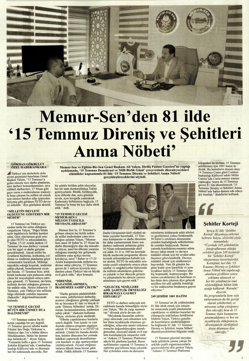 Memur-Sen Genel Başkanı Ali Yalçın, Diriliş Postası Gazetesi’ne yaptığı açıklamada, ‘15 Temmuz Demokrasi ve Milli Birlik Günü’ çerçevesinde düzenleyecekleri etkinlikler kapsamında 81 ilde ‘15 Temmuz Direniş ve Şehitleri Anma Nöbeti’ gerçekleştireceklerini söyledi.