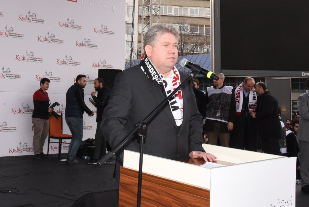 İHH Genel Başkanı Bülent Yıldırım da yaptığı konuşmada İsrail’e seslendi. Yıldırım “İsrail bu sesleri duyuyor. Bir gün sıra gelecek Kudüs’e akacağız. İsrail korkaktır, ahlaksızdır. Mavi Marmara’da en gelişmiş silahlarınızla geldiniz ve dayak yediniz. Eğer Kudüs’e Mescid-i Aksa’ya saldırmaya devam ederseniz, ateş olur üzerinize yağarız. Amerika ve İsrail zannediyor ki biz meydanlara çıkacağız birbirimizin gazını alacağız, konuşmalarını yapacağız ve sonra mesele soğuyacak biz unutacağız. Yanıldınız. Kabul etmiyoruz. Biz iman ettik ki Kudüs’ün etrafında cihad devam edecek. Biz de gerekirse mücahid olarak oralara kadar geleceğiz. Gerekirse bir kez daha Mavi Marmara’da olduğu gibi yola çıkacağız. Hava yoluyla kara yoluyla gerekirse yürüyerek gideceğiz” şeklinde konuştu.