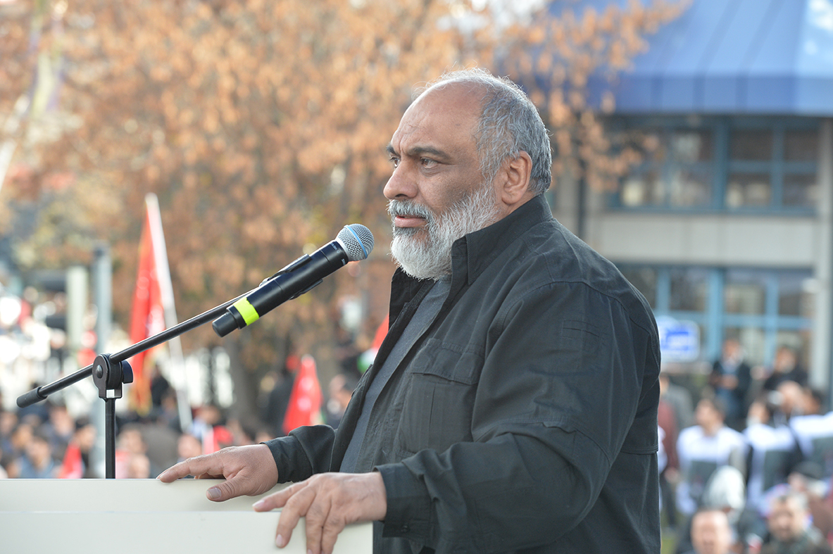 Konuşmasına, Filistinli direnişçiler, İmad ve Ayşe Masluhi’nin onurlu mücadelelerini anlatarak başlayan Ali Yalçın, “Elleri kanlı, cüzdanları dolu Siyonistler; sanıyorlar ki, silahla, olmadı parayla Arz-ı Mevud’u gerçekleştireceklerini zannediyorlar, yanılıyorlar! Selahaddin yürekli Abdurrahmanların intifadası karşısında yenilecekler ve diz çökecekler. Ömrünü Kudüs’e, Filistin’e, Aksa’ya adanmış Ayşe’lerin onuru karşısında kaybedecekler. Ortadoğu’dan, Makam-ı Miraç’tan, Mevki-i İsra’dan, Kudsi Şerif’ten defolup gidecekler” diye konuştu.
