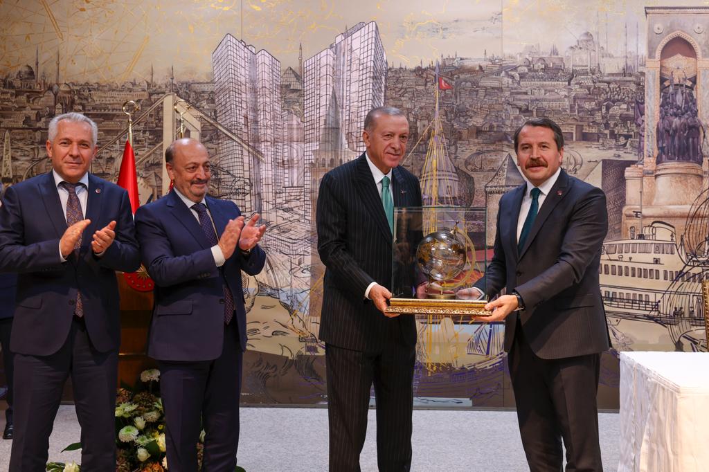 Kabul töreninde; Memur-Sen Genel Başkanı Ali Yalçın ve ILC Genel Sekreterliği'ne seçilen Mehmet Emin Esen Cumhurbaşkanı Recep Tayyip Erdoğan'a hediye takdiminde bulundu.
