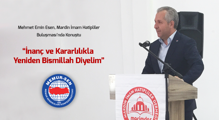 Mardin İmam Hatipliler Buluşması’nda konuşan Memur-Sen Genel Başkan Yardımcısı Mehmet Emin Esen, “Çağın İbn-i Sina’larının, Gazali’lerinin yetişeceği zemin İmam hatiplerdir. İmam hatip neden var, imam hatipliler ne için çaba sarf ederler? Çağımızın Hilfü'l-Fudûl’u olmak, hakkı tutup kaldırmak için. Şimdi, yılmadan usanmadan bu hususta çalışmalıyız. Gelin bu inançla ve kararlılıkla yeni Bismillah’lar çekelim” dedi.