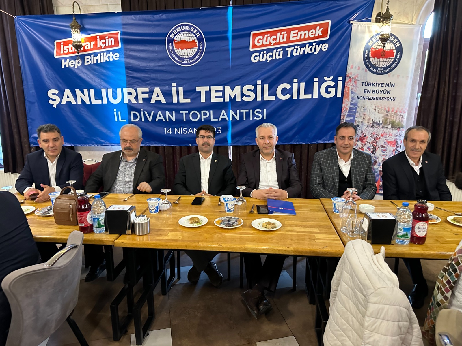 İl divan programında konuşan Memur-Sen Şanlıurfa İl Temsilcisi İbrahim Coşkun ise "15 Mayıs mutabakatına doğru gittiğimiz bu süreçte teşkilat olarak sahada ulaşılmadık kimse, ayak basılmadık iş yeri bırakmamalıyız. Kalan bir aylık süreyi iyi değerlendirmeli, 1 milyon 100 bine yürüyen üye sayısı hedefi için çalışmalı, Zirvedeki çıtamızı çok daha yukarılara koymak için gayretimizi sürdürüyoruz. İnşallah 15 Mayıs’ta üye sayımızı çok daha iyi noktalara getireceğiz” diye konuştu.