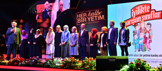 Bu arada programın yapıldığı salona "Her kalbe bir yetim", "Yetim gülerse dünya güler", "İki cihanda gülmek için siz de bir yetim sevin" yazılı afişler ve Türk bayrağı asıldı.