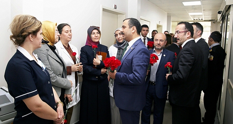 Memiş sağlık çalışanlarına karanfil vererek, Kadınlar Günü’nü kutladı.