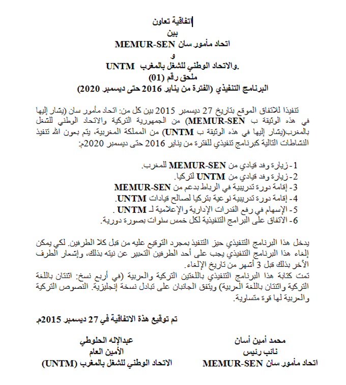 Fas Ulusal İşçi Sendikası`nın (UNTM) daveti üzerine; bu ülkeye giden Memur-Sen Genel Başkan Yardımcısı Mehmet Emin Esen, Fas UNTM Konfederasyonu Genel Başkanıyla eğitim ve iş birliği sözleşmesi imzaladı. Sözleşmeyle iki ülke sendikası arasında var olan ilişkilerin daha da güçlendirilmesi hedefleniyor.