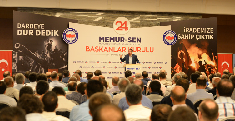24. Memur-Sen Başkanlar Kurulu Ankara’da gerçekleştirildi. Başbakan Yardımcısı Prof. Dr. Numan Kurtulmuş’un da katıldığı ‘Başkanlar Kurulu’nda konuşan Memur-Sen Genel Başkanı Ali Yalçın, “15 Temmuz 2016 Cuma akşamı; milletin iradesine darbe vurmak, devletin yönetimi üzerinde cunta kurmak, Türkiye’yi efendilerinin işgal coğrafyası yapmak isteyen FETÖ’nün kanlı darbe girişimiyle karşı karşıya kaldık. İhanet şebekesinin okyanus ötesindeki elebaşı ve haşhaşilerinin vahşetini hep birlikte yaşadık. Millete kan kusturmak, devlete diz çöktürmek istediler. 1071’den bugüne bu toprakların en sinsi, en kirli, en acımasız terör ve ihanet şebekesi, kırk yıllık sızıntıyı, milleti yutacak bir akıntıya dönüştürmeye kalktı” dedi.