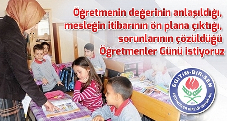 Öğretmen, eğitim hizmetinin merkezindedir. Öğretmeni dikkate almadan verimli ve başarılı bir eğitim hizmeti verilemez. Öğretmenlerin gönülden iştirak edecekleri, kökü derinlerde bir Öğretmenler Günü özlemiyle; tüm öğretmenlerimizin emeklerinin değerinin anlaşıldığı, mesleğin itibarının ön plana çıktığı, sorunlarının çözüldüğü ve Öğretmenler Günü`nün sivilleştiği günler diliyoruz.
