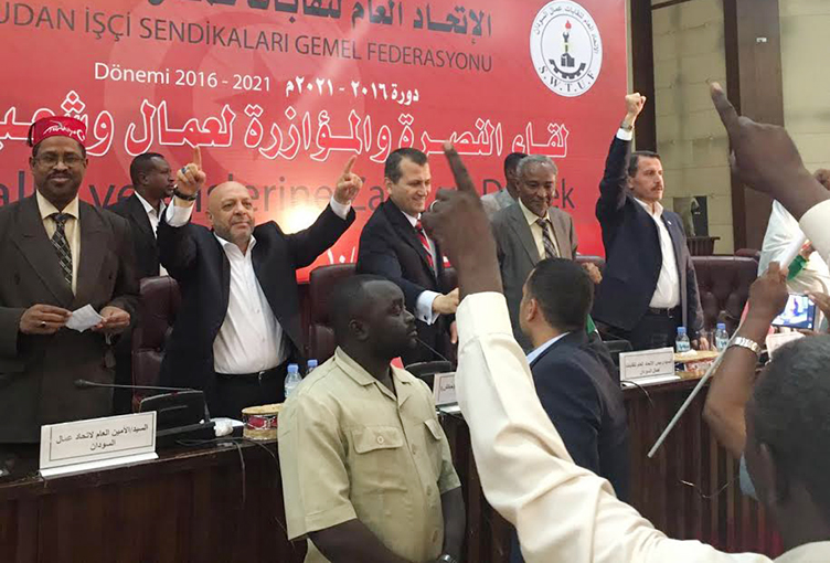 Sudan İşçi Sendikaları Konfederasyonu'nun (SWTUF) Başkent Hartum’da organize ettiği "Türk Halkı ve Türk Çalışanlarına Destek ve Dayanışma Toplantısı"nda, FETÖ'nün kanlı darbe girişimi protesto edildi. Türkiye'ye destek olmak amacıyla düzenlenen toplantıya Memur-Sen Genel Başkanı Ali Yalçın, Hak-İş Genel Başkanı Mahmut Arslan ve Sudan’da yaşayan Türkler de katıldı. Yaklaşık 3 bin 500 kişinin katılımı ile gerçekleştirilen gösteride, Türkiye ile ilgili bir sinevizyon gösterisi yapıldı, başta Cumhurbaşkanı Recep Tayyip Erdoğan olmak üzere, seçilmiş siyasetçilere destek açıklaması yapıldı, sık sık Cumhurbaşkanı Erdoğan lehine sloganlar atıldı.