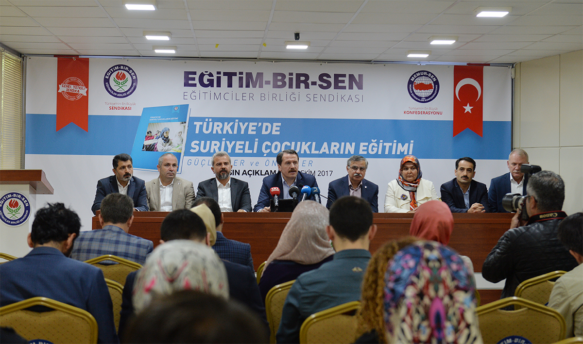 Memur-Sen ve Eğitim-Bir-Sen Genel Başkanı Ali Yalçın, Eğitim-Bir-Sen Genel Merkezi’nde düzenlenen basın toplantısında “Türkiye’de Suriyeli Çocukların Eğitimi: Güçlükler ve Öneriler” başlıklı raporun detaylarını açıkladı.