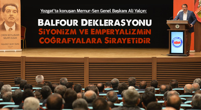 Yozgat’ta konuşan Memur-Sen Genel Başkanı Ali Yalçın, “Balfour Deklarasyonu, ortadoğunun tüm coğrafyalarına sirayet eden, yenidünya düzenine kapı aralayan, siyonizmin ve emperyalizmin bölgedeki tahakkümünü güçlendiren yüzyıllık bir süreci başlattı. Deklerasyon, siyonizmin, emperyalizmin ve dolayısıyla, kaosun, sömürünün mazlum coğrafyalara sirayetidir, ülkeleri bölmenin, insanları ayrıştırmanın başlangıç noktasıdır” dedi.