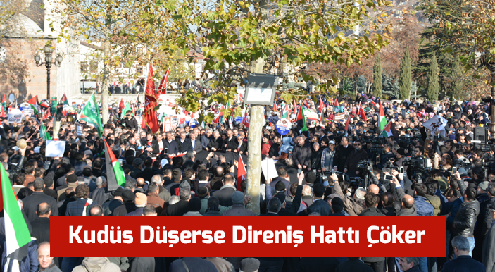 “Bütün dünya, uluslararası hukuk ve BM Kararlarını ihlal eden bu kararı reddetmeli ve Filistin halkının yanında yer almalıdır” diyen Yalçın, “Çünkü esir edilmek istenen sadece Kudüs değildir. Kudüs, emperyalizme karşı direnişin sembolü olduğu ölçüde dünya zulüm sisteminin hedefi olmaktadır. Kudüs teslim olursa, Kudüs’ü teslim edersek dünyanın geri kalanı kolay bir lokmaya dönüşecektir. Kudüs, direnişin en stratejik, en önemli hattıdır. Kudüs düşerse direniş hattı çöker. Bu böyle bilinmelidir. O nedenle her kim kendisini antiemperyalist olarak, sömürge karşıtı olarak tanımlıyorsa, onları ve tüm Müslüman dünyayı Kudüs direnişi etrafında kenetlenmeye çağırıyoruz. Dünya özgür olmak, sömürü düzeninden kurtulmak istiyorsa, Kudüs’ün sömürü; işgal ve hadsizliğin sembolü olan Siyonist işgalcilerden kurtulması için dayanışma içinde olmalıdır. Kudüs, dayanma noktamızın son sınırıdır. Kudüs’ten sonra kimse bu ümmetten barış ve aklıselim lafları beklemesin. Kudüs’ün sonrası ancak öfkedir, kavgadır, intifadadır. Bu ümmet bu noktadan sonra, Kudüs fatihi Selahaddin gibi “Allah’ın evi esaret altındayken, Selahaddin nasıl kendi evinde yatar?” deyip ayağa kalkar ve Kudüs özgür olana, Siyonizm Filistin’den defolup gidene kadar asla oturmaz” şeklinde konuştu.